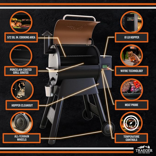 - Included Meat Probe and All-Terrain Mobility: Monitor internal food temps without lifting the lid of your Traeger smoker grill using the integrated meat probe. Durable wheels and sawhorse chassis provide stability and portability for your outdoor grilling setup.